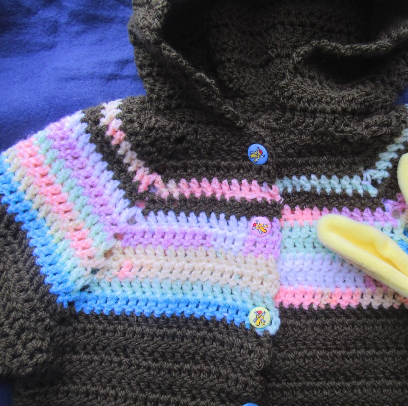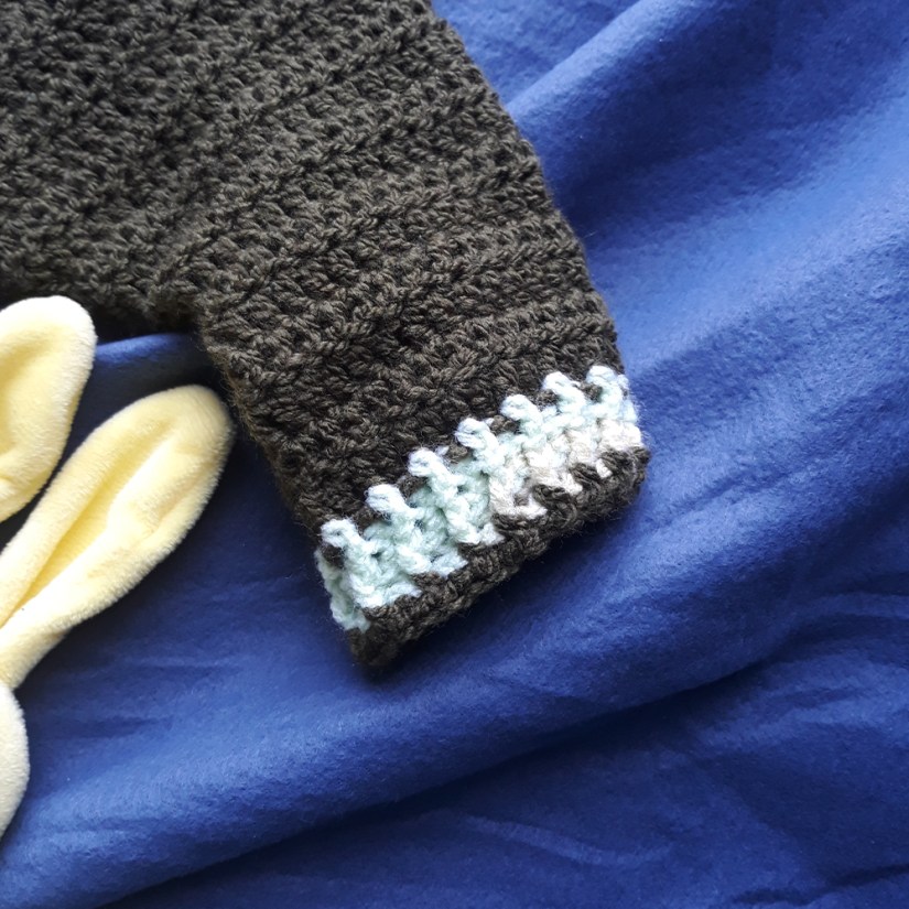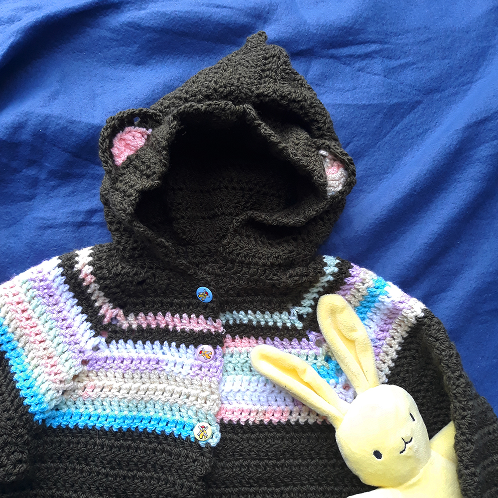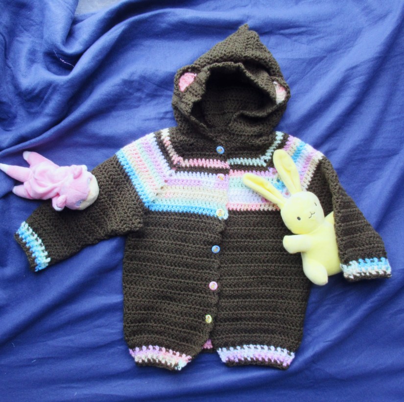 After choosing my yarn I got stuck into the pattern, adding a few pastel stripes to jazz things up. I also added a cuff and hem pattern using alternating Front Post Double Crochet (Fpdc) and Back Post Double Crochet (Bpdc) around the same number of stitches. I did two rows of this pattern in the pastel yarn and then one row of alternating Front Post Half Double Crochet (Fphdc) and, you guessed it, Back Post Half Double Crochet (Bphdc). This creates a lovely effect and makes the cardigan feel a little bit fancy for almost no extra effort! I also added a contrasting inner to the ears to make them pop. I did this by crocheting the same pattern for the ear but stopping after the first row, finishing off and stitching it inside the full ear. EASY!