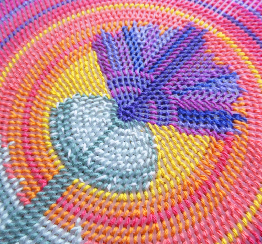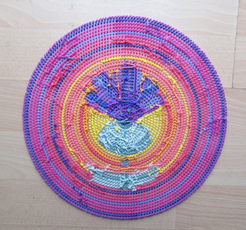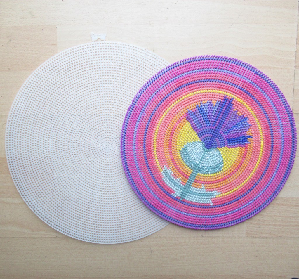 In the end I have to admit that I cut the last few rows off my plastic canvas – super easy since it’s a thin but sturdy plastic! The original piece was 31cm or 12″, the same as this one, but the finished diameter is 26cm including the very simple slip stitch edge I chose. In the future when I’m feeling up for making a second weave, this piece may become part of a funky bag and I decided that it had reached a good enough size for that purpose (not to mention I was dying to finish).