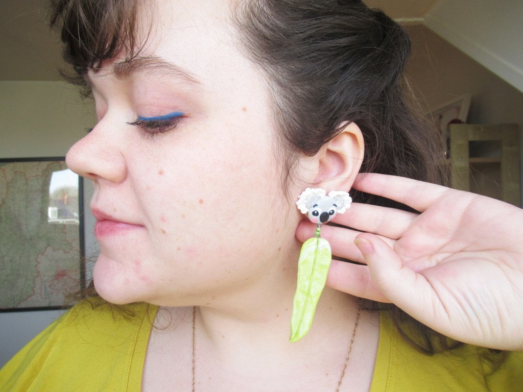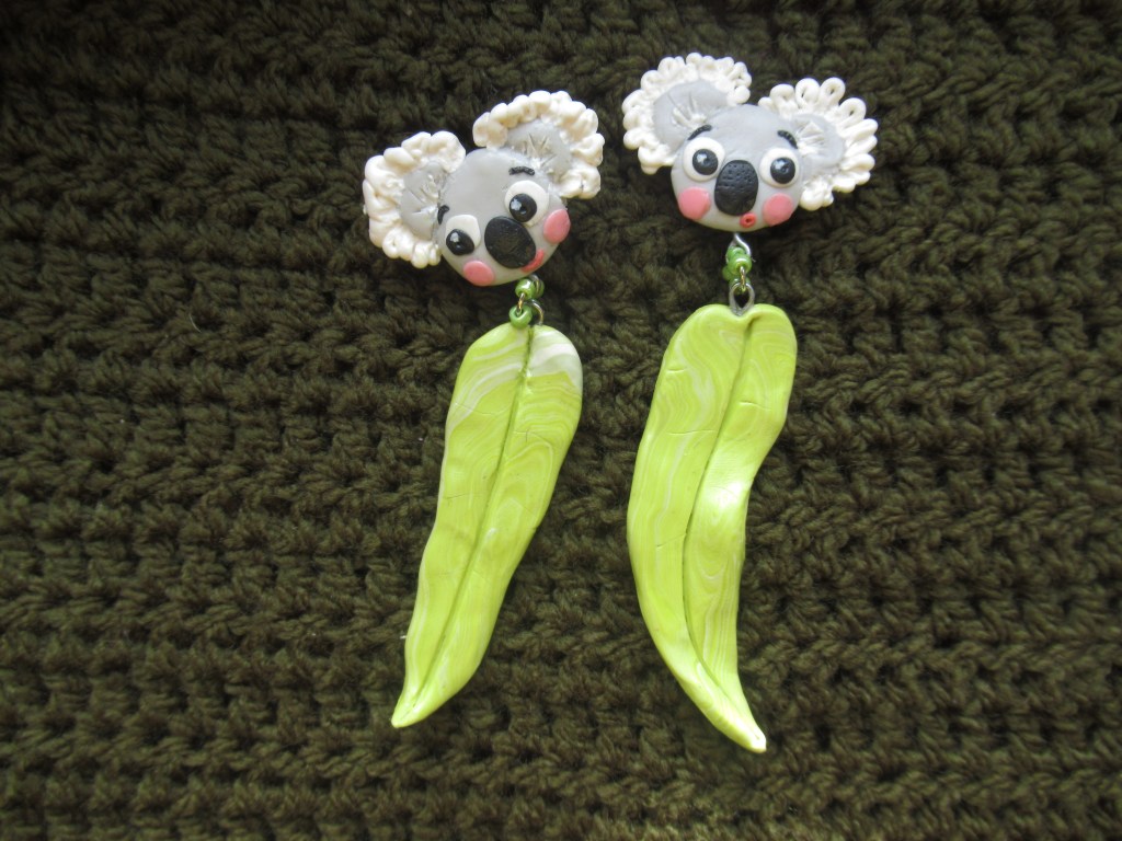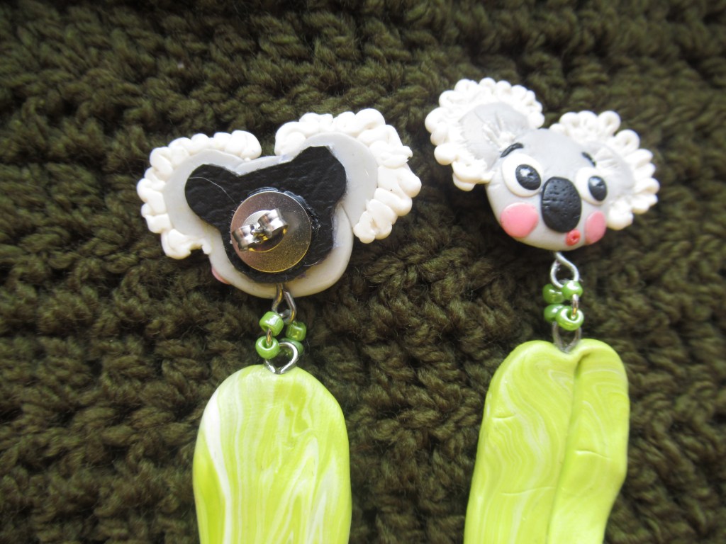 I ended up using some generic matte top coat (mine was from a shop called Action here in the Netherlands) to seal them which gives them a light sheen but will hopefully protect them for prosperity! Next, I knew my friend’s sister had a birthday coming up and they were going to make a lovely birthday donation to WIRES, the NSW Wildlife Information Rescue and Education Service. To say thank you and as a little surprise extra I thought I would try to recreate my koala as a pair of stud earrings with some classic eucalyptus leaves. I used some jewellery findings and beads to join the pieces, used E6000 glue to secure everything, and voila. I think I’ll have to make a pair of these for myself!
