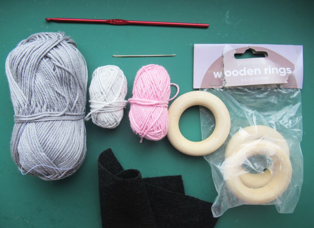 - 100% cotton crochet yarn (I bought mine from Pipoos here in the Netherlands) in grey and white, some pink for cheeks if wanted
