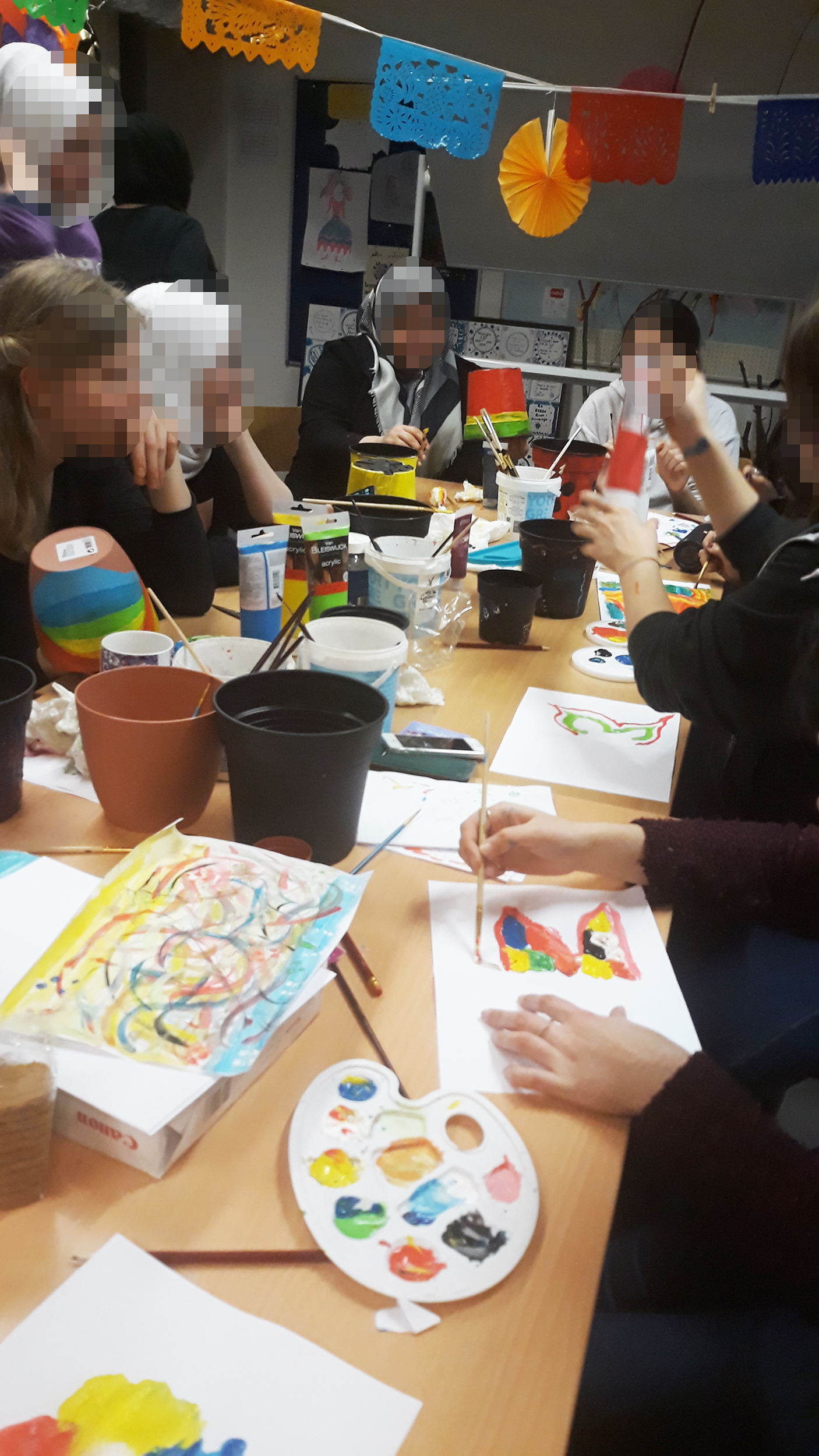 - BYO water! Something I haven’t mentioned is the lack of access to water in our craft space at the refugee centre. We (volunteers) only have access to the staff bathroom upon request and find it a bit of a hassle to get water for painting or for cleanup afterwards. My solution this week was to bring my own water in plastic bottles which worked a treat. For clean up we pour all the dirty water into one container and it goes on a hedge outside the centre! I wrap the used brushes and palettes in a plastic bag, make sure it’s secure, then take it home to wash in my kitchen sink. This is a low-fuss option if you’re working in a space which doesn’t have easy water access or need to get out quickly.