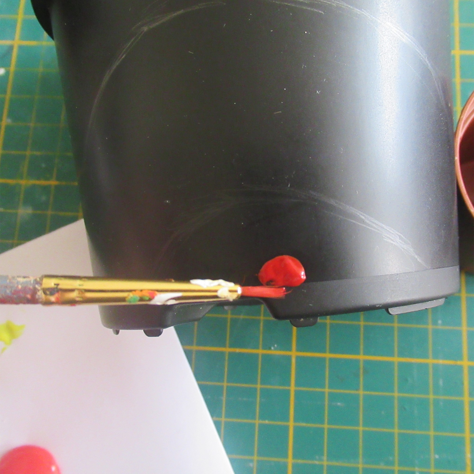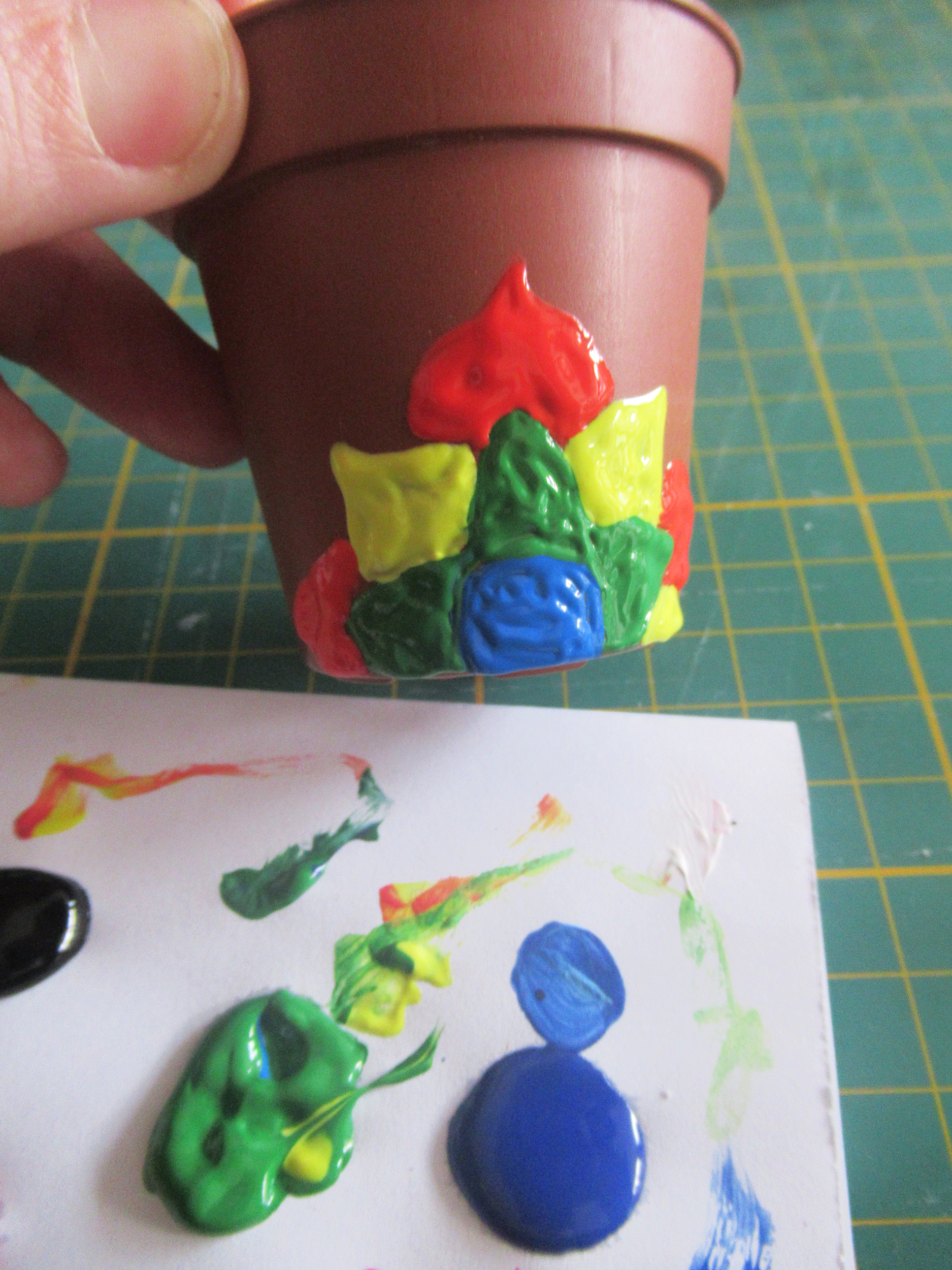 I also painted this tiny pot with a simple flower shape. You can see that I used a lot of acrylic paint (below left) to make sure the flower was opaque. Just make sure to load your brush with lots of paint and push it around gently, some practice will help you work out your own technique.