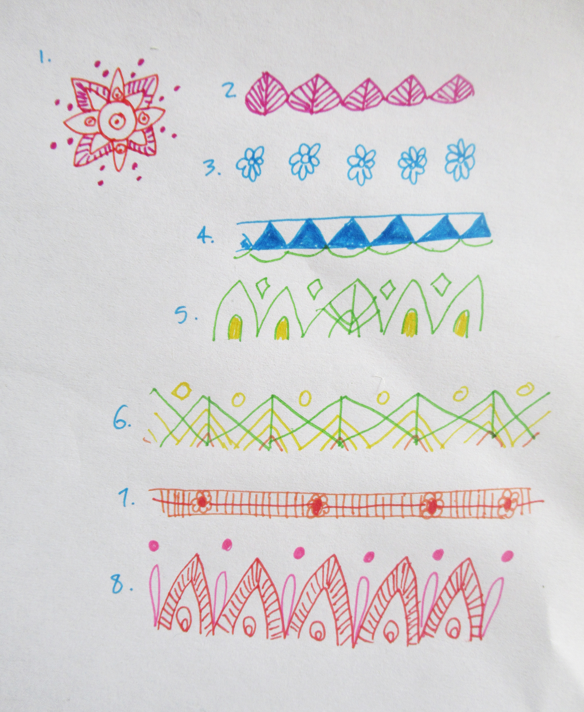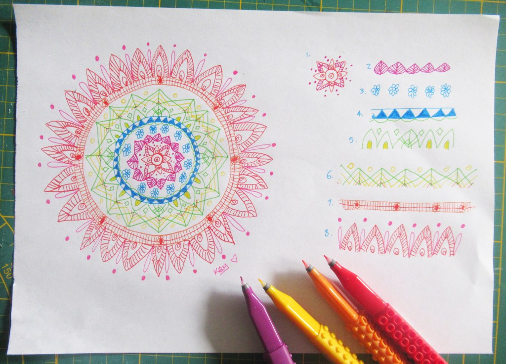 Once you have drawn out your circle(s), now comes the fun part! Above I have broken down the rounds I used in my mandala and numbered them 1 – 8. If you or your group are feeling nervous about your drawing skills, start by just drawing out some patterns in straight lines. There are great resources for patterns online and all around you (I’ve saved some of my faves on my Pinterest board for this project). Look around for Henna designs, tattoo designs, fabric and other prints, journalling photos or photoshop brushes – just to name a few!